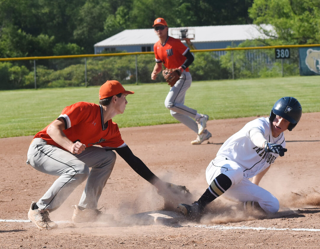 Frewsburg’s Garrett Brink steals third base ahead of a tag from Wilson’s Tyler Durow during Thursday’s Section VI Class C semifinal at the Robert H. Jackson Sports Complex in Frewsburg.