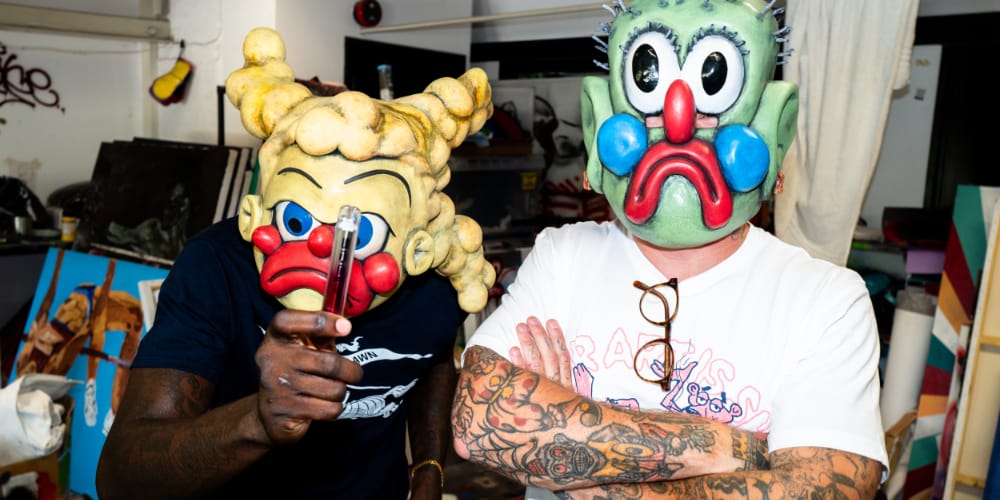 For the drop, Opake introduces anime-inspired works that question ideas of what’s considered obscene. Slawn adds his trademark energy, layering clown-like figures, scrawled masks, and warped grins across the pieces. The result is a mix of playful and satirical, with TABOO presenting two artists working freely on their own terms.