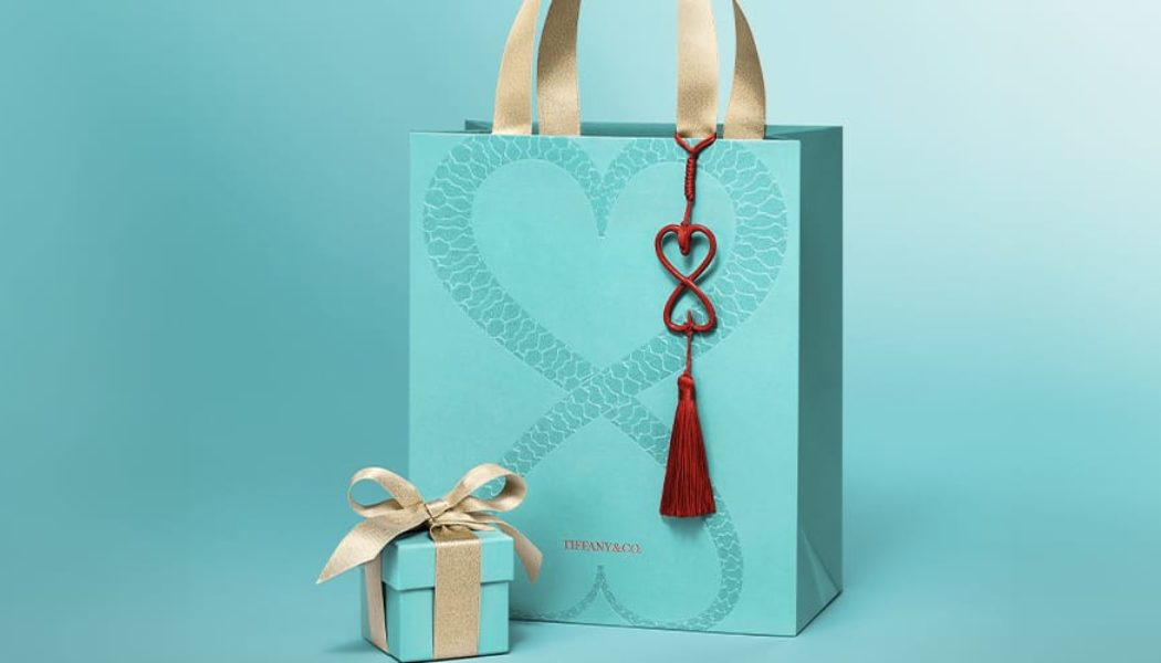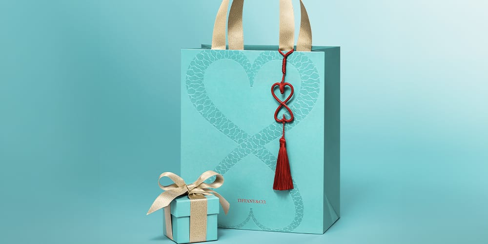 The collaboration also includes special Chinese New Year packaging that Wang has specifically designed for Tiffany. The Maison’s signature jewelry box and shopping bags are reimagined with gold ribbons and handles in a shimmery finish. Emblazoned on the bags are heart-shaped serpent-pattened embossings that form an infinity symbol-esque shape. Hanging from the handle is Wang’s modernized take on traditional Chinese charms, which reiterates the heart-like loop motif in a vivid red complete with tonal tassels.