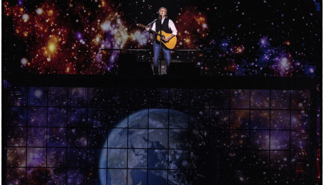 It wasn’t difficult then to get swept up in the collective enthusiasm of 12,000+ people all overjoyed to be in the presence of an actual Beatle, which helped paper over the minor and major sins of the evening as it was happening. Hours later, I still have questions for the person who designed the tour’s video content for their decision to re-use footage from two promotional clips (for “My Valentine” and “Queenie Eye”) that prominently featured Johnny Depp. And while the sentiment was nice enough, featuring animation of major cities like Paris and London looking wrecked by some global catastrophe only to have their landmarks and ground overtaken by colorful flowers during “Getting Better” felt like a willful misreading of the global room.