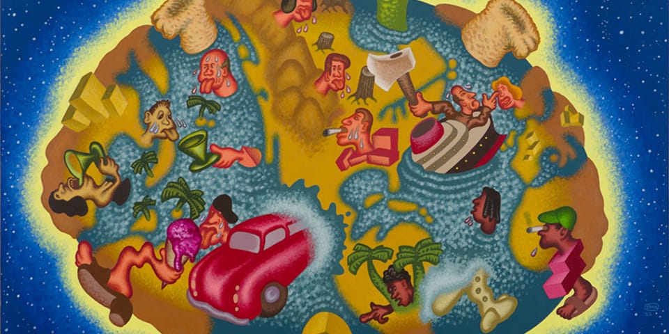 Housed at New York-based gallery, Venus Over Manhattan, Saul’s latest self-titled show presents paintings created between 2022 and 2023. His latest works probe into a number of pertinent issues: from Global Warming (2022 & 2023), where he satirizes the global communities neglect of the climate emergency, to Last Dime (2022) and Rain (2023), in which Saul makes humorous critiques on capitalism, in relation to society’s relationship with money and natural phenomena.