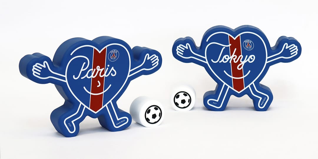 At the center of this pop-up is a new take on Ceizer’s famed Woody sculpture line and a duo of hand-drawn T-shirt designs. The hand-painted Woody sculptures are dressed in PSG’s familiar blue, red and white palette, feature the club’s crest, read “Paris” on one side and “Tokyo” on the other, and, in a fine bit of fan service add “Est Magique” in small text on both sides for a nod to one of PSG’s slogans. A finishing touch is provided by a small wood soccer ball sculpture, and each comes packaged in a custom wood box. The Woody is limited to a run of 12, and each is hand-signed and numbered on its feet.