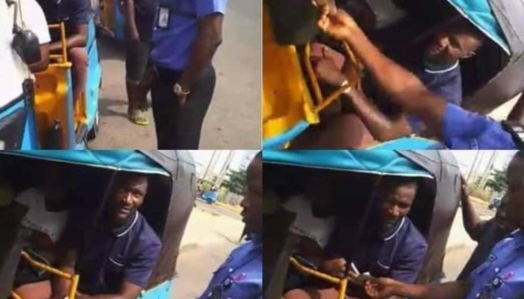 An unidentified policeman was spotted in a video giving cash gifts to a tricyclist in Enugu State and his passengers.
