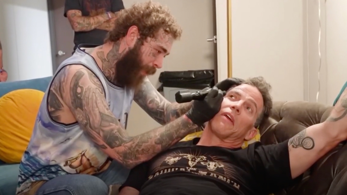 A video posted by TMZ shows the two meeting up ahead of Posty’s headlining performance on Friday night and turning the backstage area into a makeshift tattoo studio. The tattoo was designed earlier this month, but Post had the honors of wielding the needle himself, starting “with the balls,” at Steve-O’s suggestion.