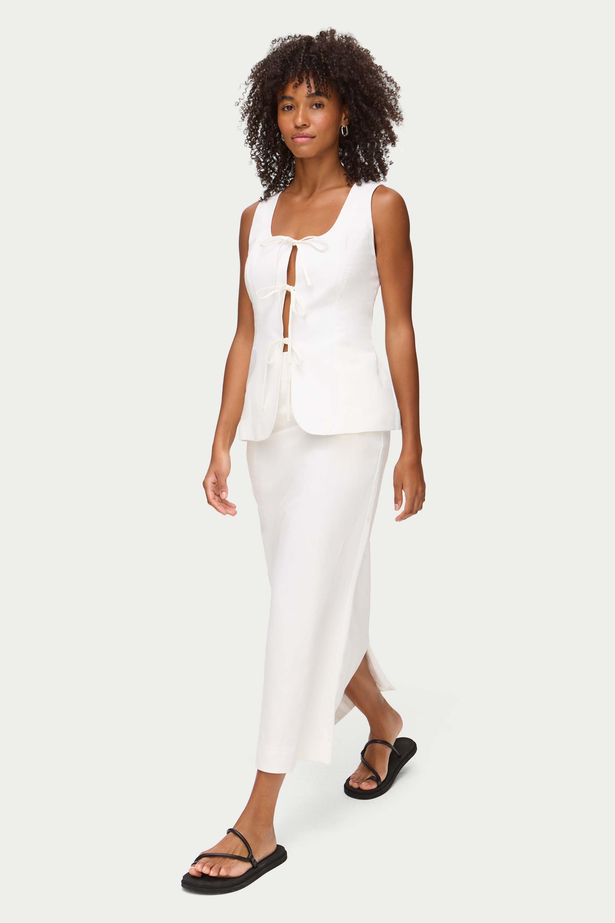 The light linen blend of the fabric brings an airy edge to your reliable midi skirt.
