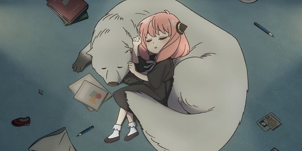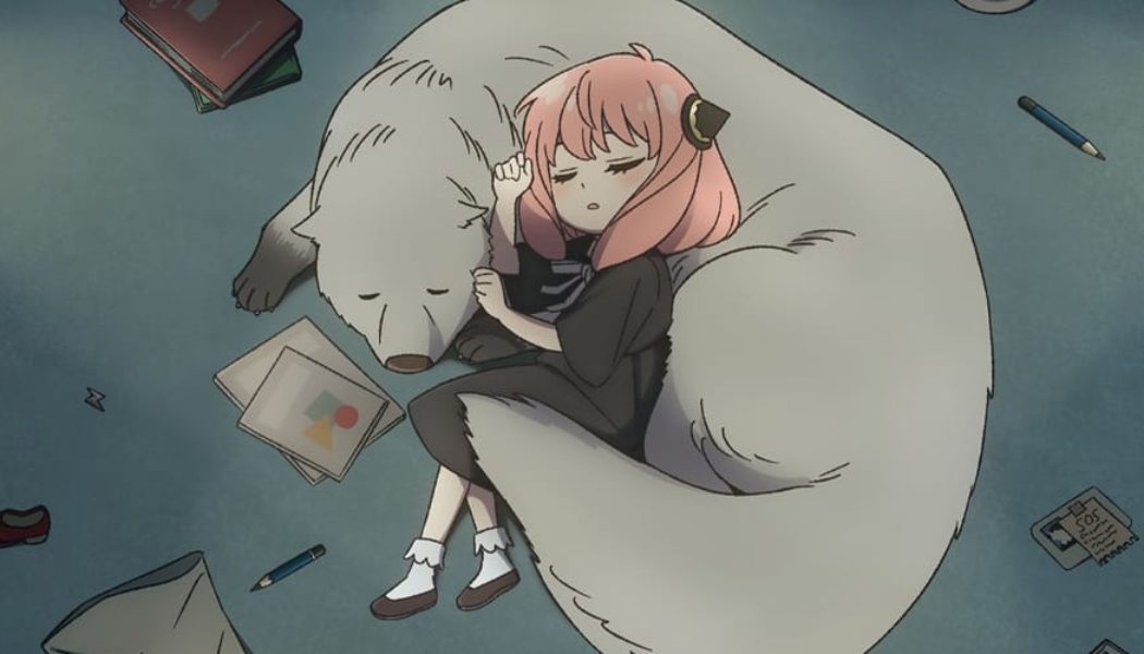 The image depicts Anya Forger and her fluffy canine companion asleep in a room scattered with toys, books, gifts and snacks — painting a heartwarming and peaceful scene of the duo falling into slumber after play.