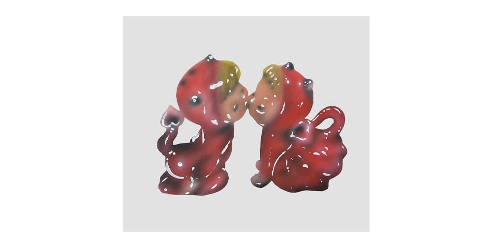 Against the bright white walls of a traditional gallery space, the works of ‘Public Life’ echo a cheeky lawlessness in their medium and composition. Samuel Almansa conjures “devilish cuteness” in portraits of porcelain cherubic figures. Rosie Clements’ rave photography finds the form of UV-print on bubble wrap. From naughty Teletubbies paintings to AI-inspired metal forms, the artists of ‘Public Life’ channel deviance and whimsy in equal breath.