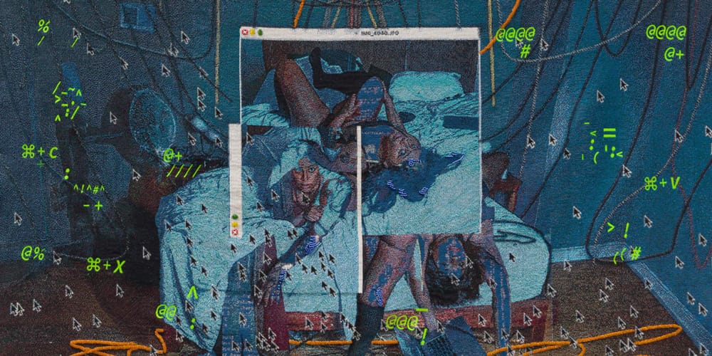 In Malware, jacquard tapestries turn digital pixels into hand-stitched poetry. Lit by the white-blue glow of a computer screen, Wood emblazons her signature webcam self-portraits with confessions of burnout and online overexposure, taking the form of Python and Java script. Her videos give this code a second life, using it to pixelate and datamosh her body out of recognition.