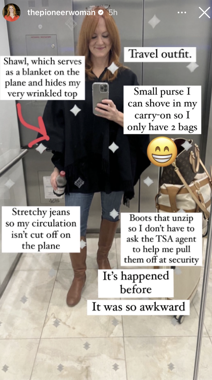 To start, you’ll want to get your hands on a cozy shawl. According to Ree, it “serves as a blanket on the plane and hides my very wrinkled top.” Talk about a win-win! Pair that shawl with stretchy jeans so that “circulation isn’t cut off on the plane,” then finish off the outfit with boots that unzip. This step is especially important to avoid any unfortunate holdups while going through security. Trust us, it happens. Or rather… trust Ree! She posts, “boots that unzip so I don’t have to ask the TSA agent to help me pull them off at security. It’s happened before. It was so awkward.” See? 😂