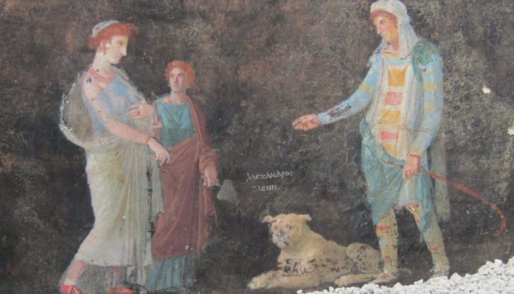 A remarkably preserved banquet hall of frescoes was recently excavated in the Ancient Roman city of Pompeii. Dating back nearly 2,000 years, the 50 foot long by 19 foot wide room was once used as an entertainment space, where cordial gatherings and conversations were believed to have taken place. Dubbed “The Black Room”, due to the black walls that were meant to prevent the smoke of the burning candle light from being seen, the room featured elaborately painted depictions of mythological figures from the Trojan War, from Spartan princess Helen to Paris, prince of Troy.