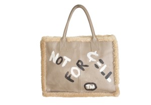 Touchingly, a patchwork workwear jacket and shearling tote read, “Not for Cell.”