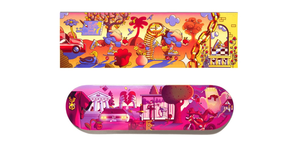 The new additions to the Meet Me on Cloud Nine art series include a skateboard, a silkscreen art print, a collaborative cardigan and a t-shirt. Each of the pieces features signature artwork from the Meet Me on Cloud Nine series. In collaboration with KidSuper, the cardigan remains a capsule highlight with signature graphic detailing in shades of peach, fuschia, beige, brown and orange.