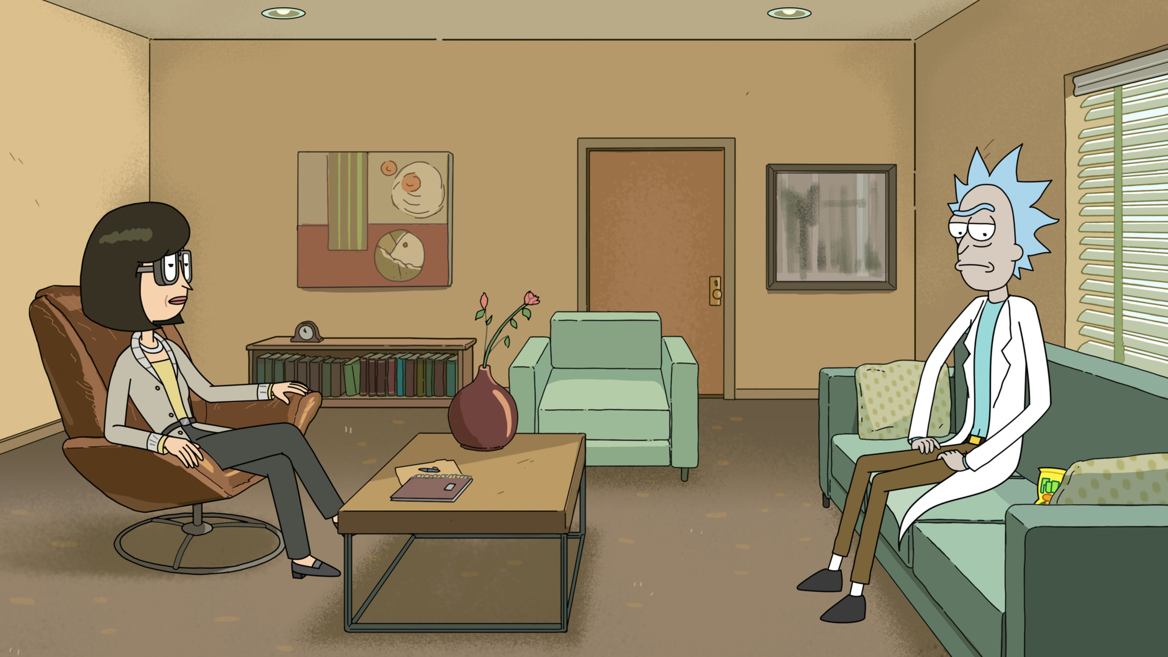 DH: I think a character like Rick being in therapy could be fun and cool the more he comes around to taking it seriously and coming around to using it. I love that he goes to her to deal with his Pissmaster problem, and he’s still treating her like she’s a vendor. He can’t cross that threshold where he truly respects her. But he has acknowledged that therapy is a science that he has not himself dominated.