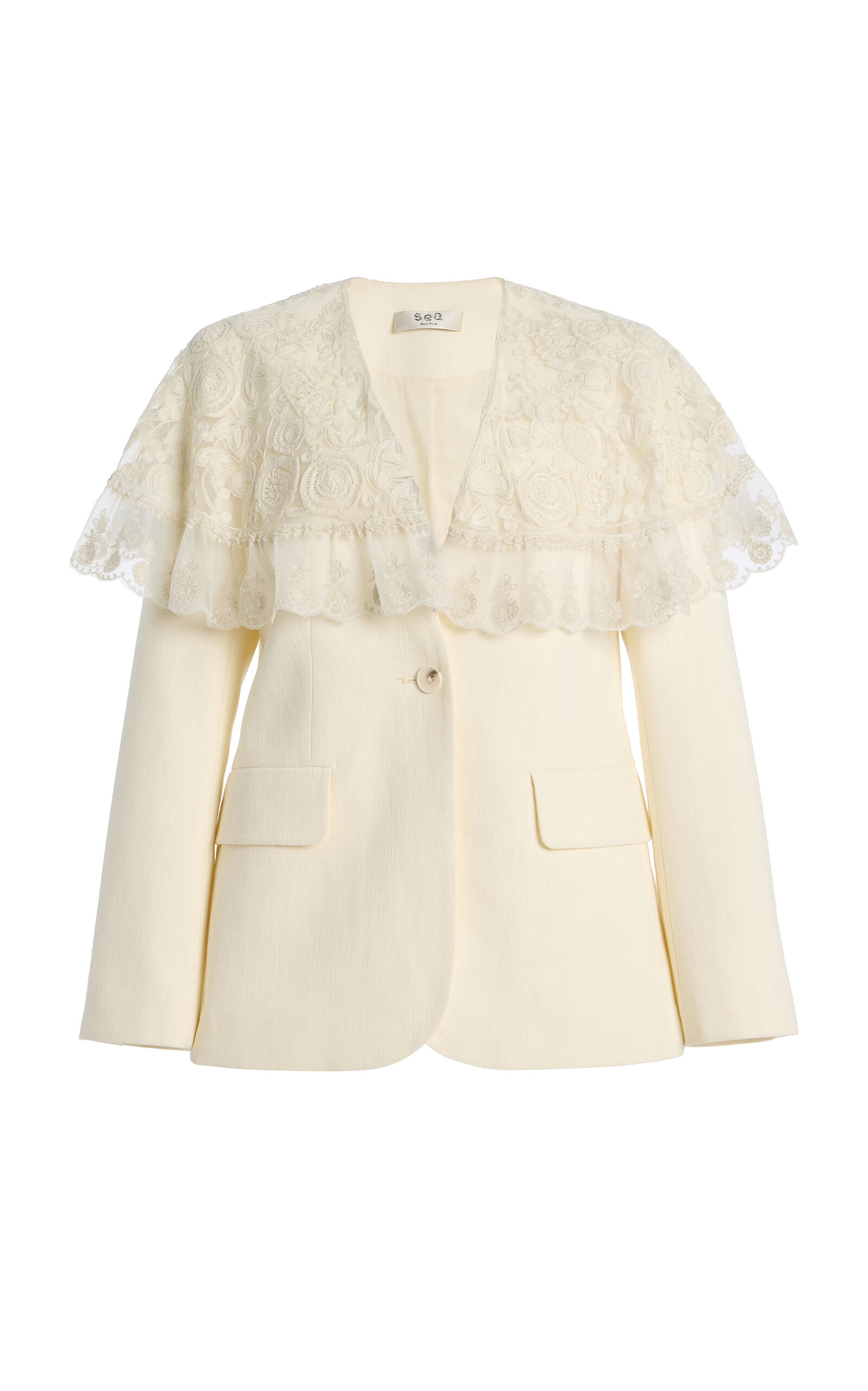 Finally, it was at Stella McCartney where lace transformed from its pure romanticism to something more forward: lace leggings. Or were they trousers? Certainly they weren’t tights. Whatever your definition, the lace bottoms mark a new evolution in lace tights and even Capri pants we’ve begun to see last winter, and their tonal olive-green shade matching the belted jacket is a styling idea I’m already expecting to see come September.