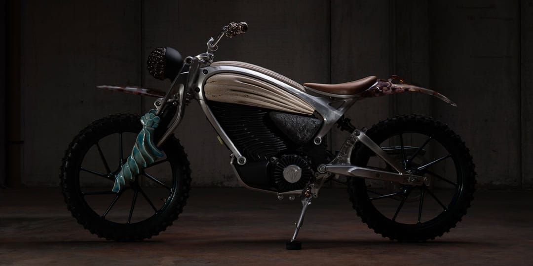Built upon the FF-C6, Flying Flea’s flagship electric motorcycle, Motototem transforms the EV into a sculptural artwork. Biagi reimagined components like the forged aluminum frame and magnesium battery case using natural materials, including travertine, clay, bronze, stone, leather and blown glass. The result is a deeply symbolic, sensory-rich vehicle that explores themes of nature, history and human connection.