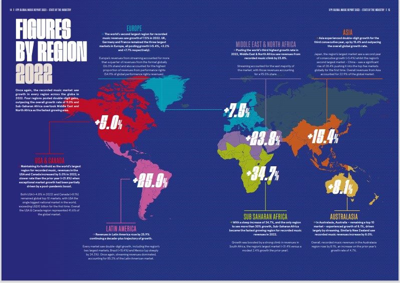 “With a steep increase of 34.7%, and the only region to see more than 30% growth, Sub-Saharan Africa became the fastest growing region for recorded music revenues in 2022. Growth was boosted by a strong climb in revenues in South Africa, the region’s largest market (+31.4% versus a modest 2.4% growth the prior year)”.