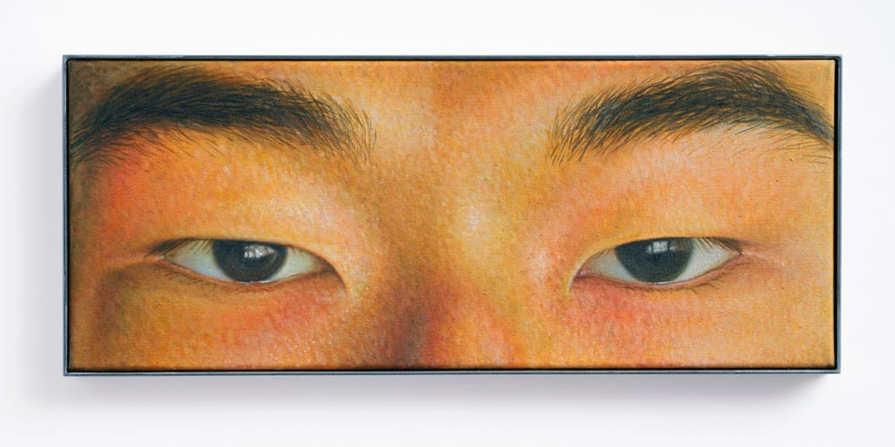 Born in South Korea and raised in the UK, Kim’s work reflects the tension of navigating two worlds. His self-portraits are anchored by several sets of searching eyes—some meeting the viewer, others looking beyond. For Kim, reclaiming this gaze becomes an act of defiance, a way of untangling the threads of racism and fetishization that shaped his time in England. Methodological and, at times, obsessive, these works transform his image from a site of consumption into one of resistance, giving way to a powerful reckoning of self image and identity.