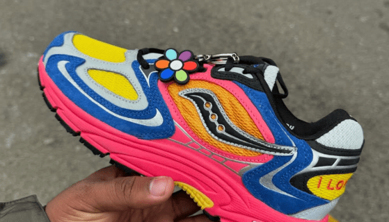 Tips and Saucony are almost a half-dozen collabs deep, and their firmly established visual language — bright, bold and colorful — is continued here. Neon-toned shades of pink, orange, yellow and blue can all be seen, with hits of white, grey and black providing a touch of easygoing contrast. A carabiner that holds a multi-colored flower is attached to the left shoe’s laces.
