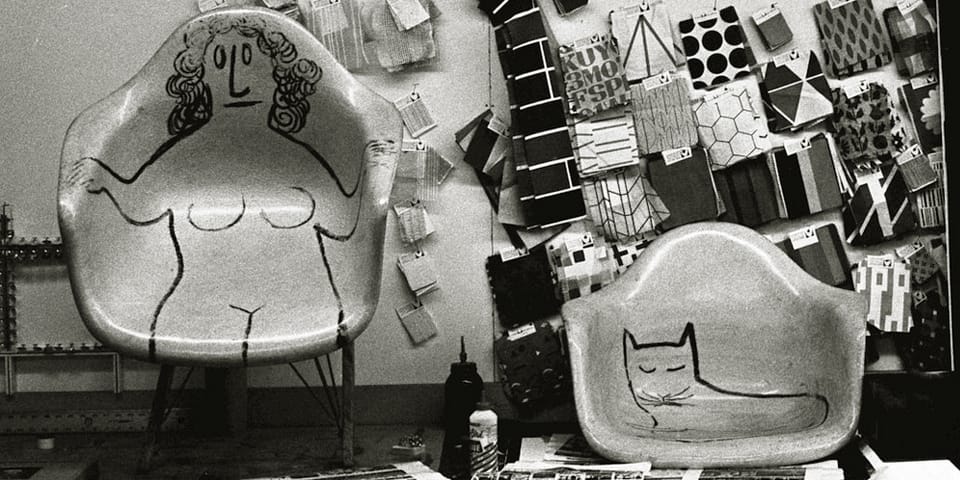 The iconic collaboration between the group came about when the artist stepped into the Eames Office in Venice where he was given free rein to draw on walls and furniture. Subsequently, these pieces are still to this day utilized in photoshoots and showroom designs. A fiberglass arm shell was decorated with a drawing of a nude woman as though she was seated with her legs splayed out while another arm shell seats a curled-up cat. A nude painting of a woman lounging in just a necklace and high heels is seen on an early prototype of the La Chaise. While Steinberg and Sterne eventually moved out of the City of Angels, his encounter with the Eames continued to influence his drawings and the group remained in contact with each other throughout their lifetime.
