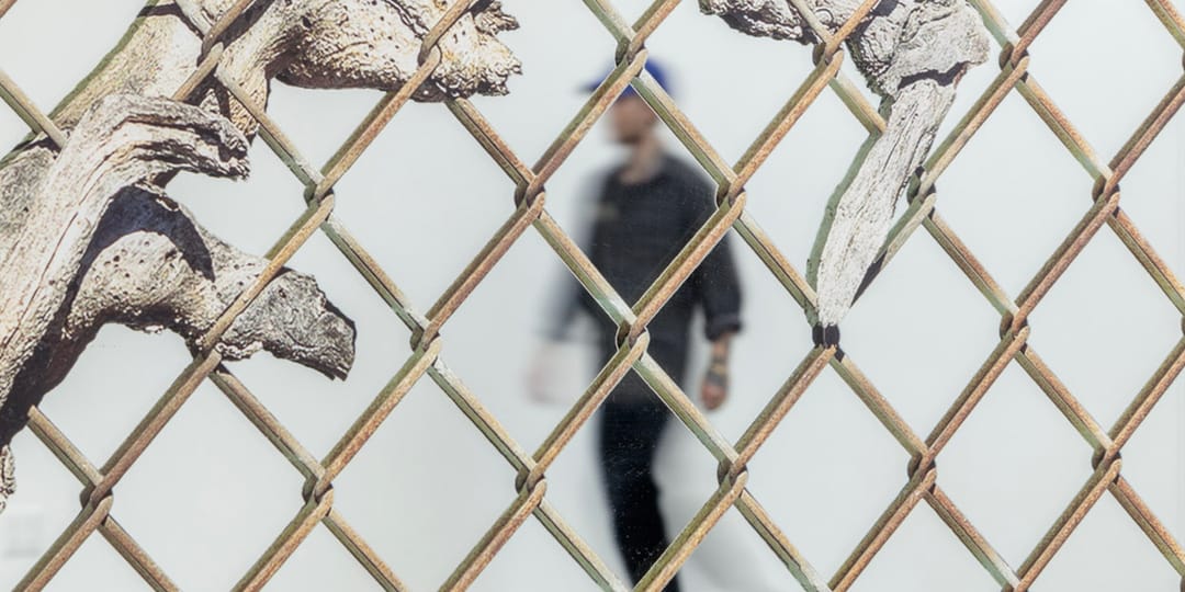 Throughout his practice, Sayre has shown an affinity for boundaries and thresholds, be it a mirror or a chainlink fence — both of which he conflates in his latest edition at a one-to-one scale. The artwork is inspired by a reflective cover that was designed for a book to complement the artist’s 2021 exhibition at François Ghebaly in New York, titled Apocalypse Porn. The UV-print on mirror “explores the original gesture further by foregrounding a collision of the built environment and the natural world while simultaneously exploiting the nature of the mirror’s surface,” noted JRP in a statement.