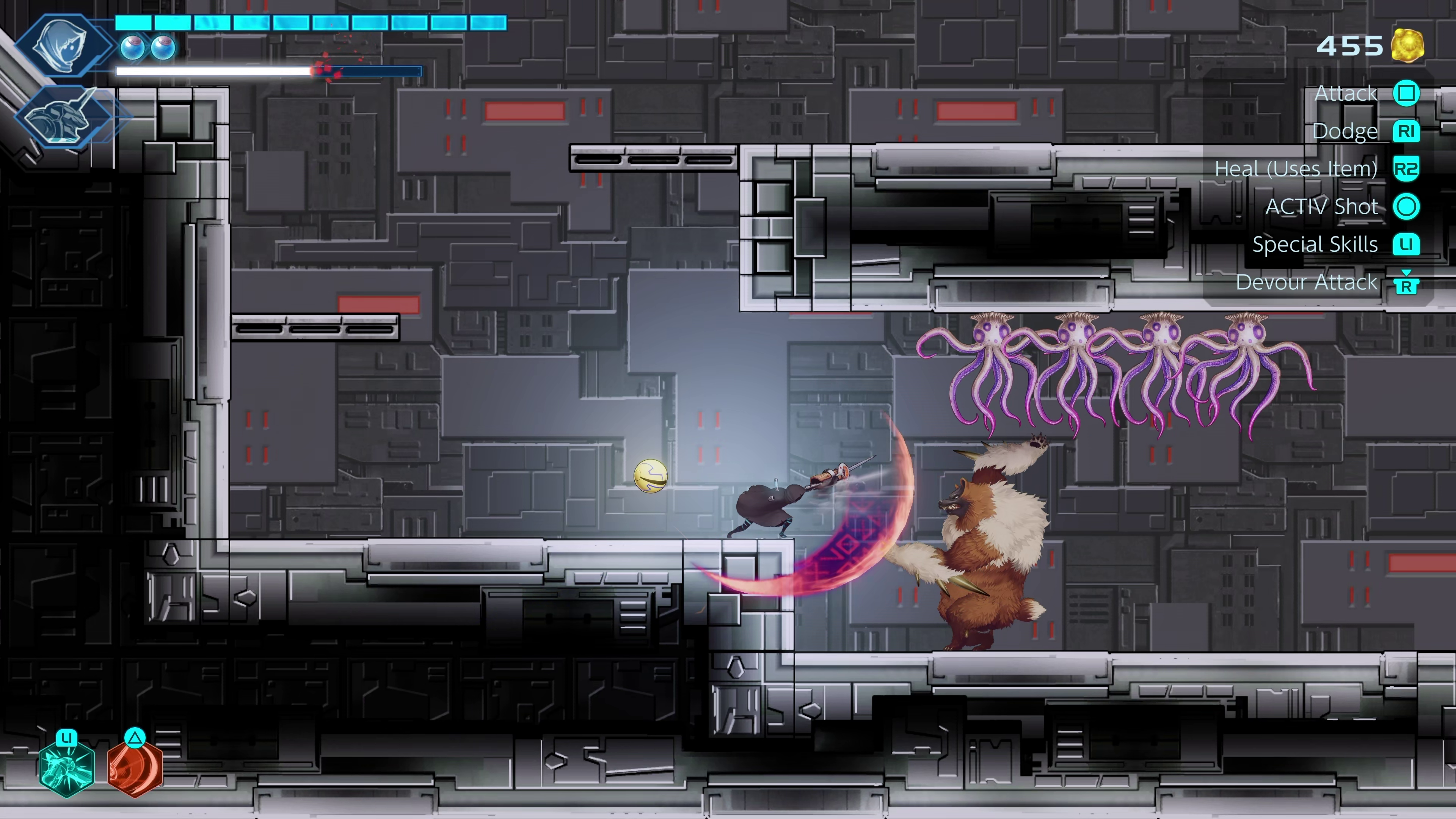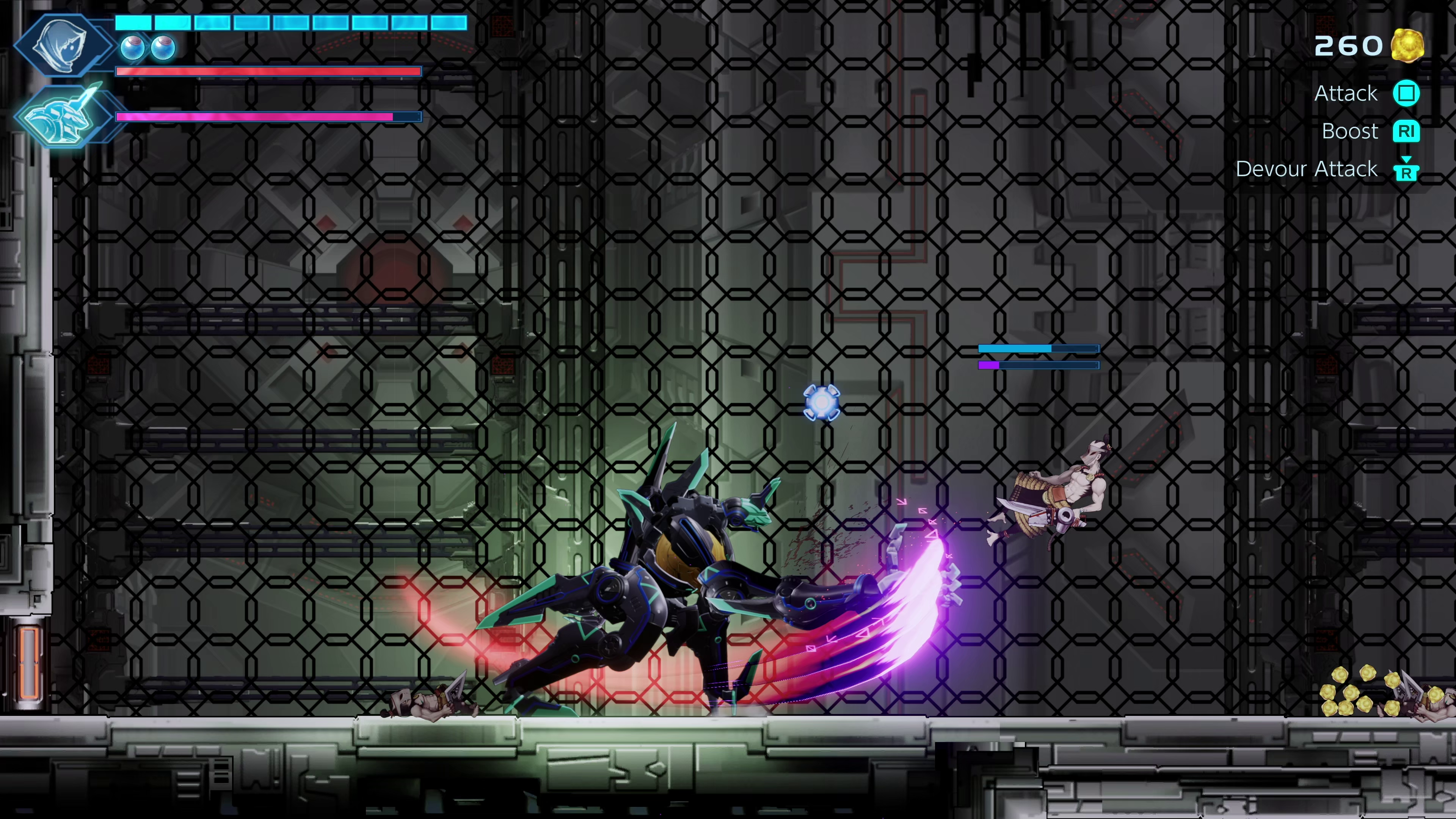 Pac-Man, oops, we mean Puck, is not just a typical mascot who follows you around. He enhances  Swordsman No.8’s abilities by allowing him to turn into a morph ball, taking cues from Metroid, or even joining with the Swordsman to turn into a giant mech who can shoot a laser beam out of his mouth.