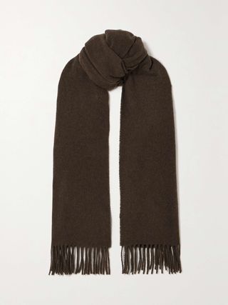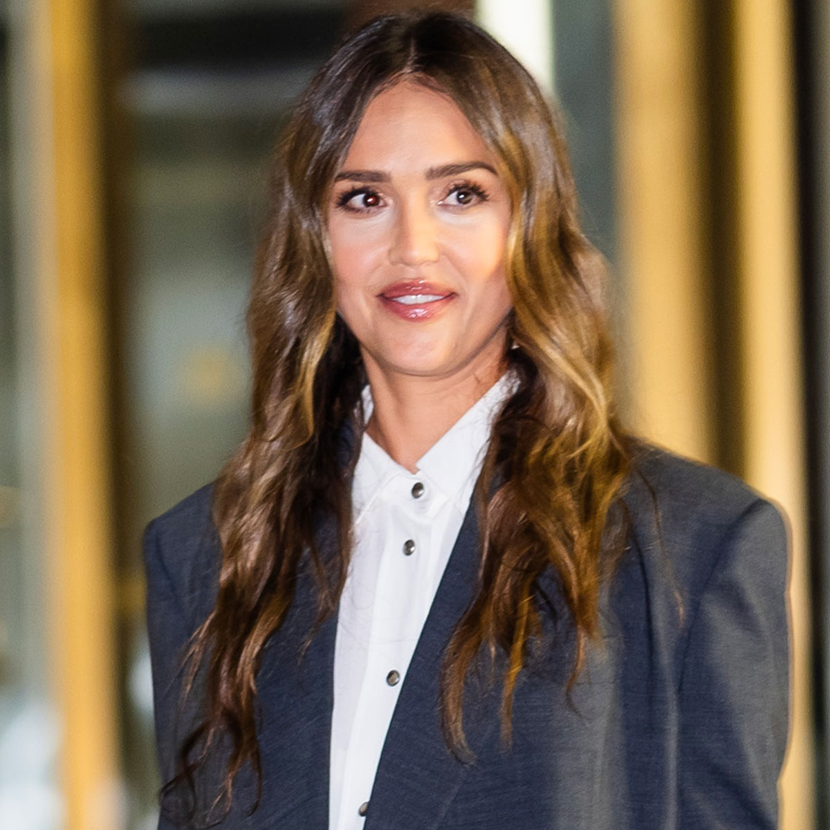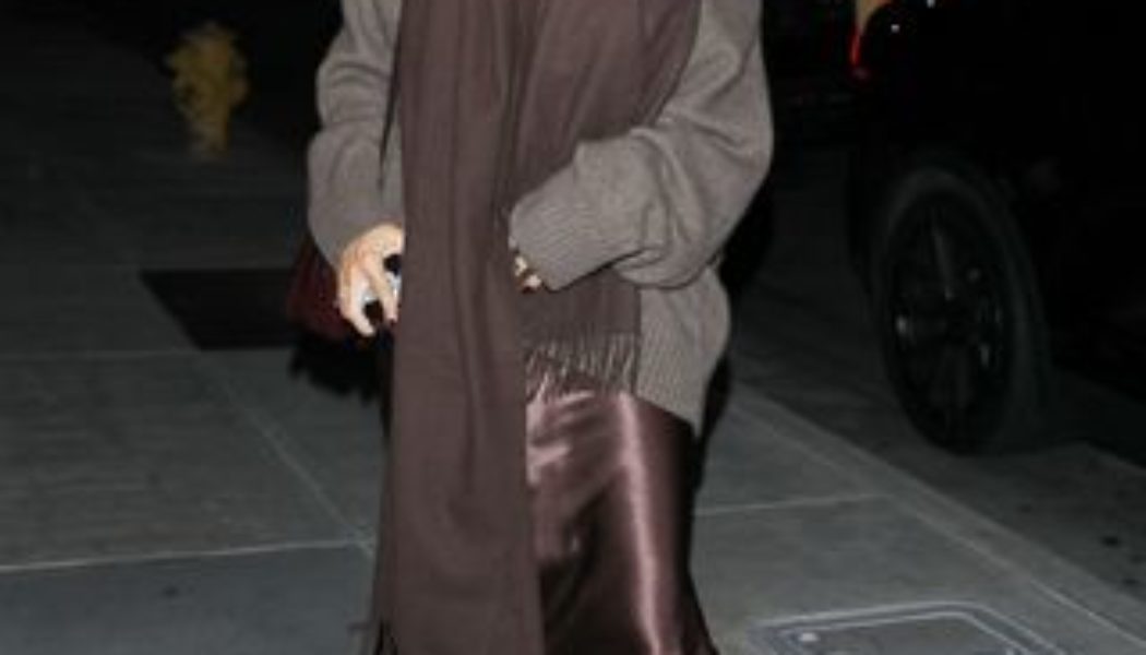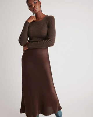 Photographed in Los Angeles this week, Alba wore an oversized sweater, satin slip skirt, knee-high leather boots, and a cozy scarf. Wearing a few different shades of brown, this look is a prime example of how to do tonal dressing right. She even went as far as to paint her nails dark brown! Now that’s dedication to a color palette. Her outfit is simultaneously weather-appropriate, elegant, and comfortable. What’s not to love? Scroll down to see Jessica Alba’s newest date-night outfit and shop similar pieces from H&M, Quince, Toteme, and more.