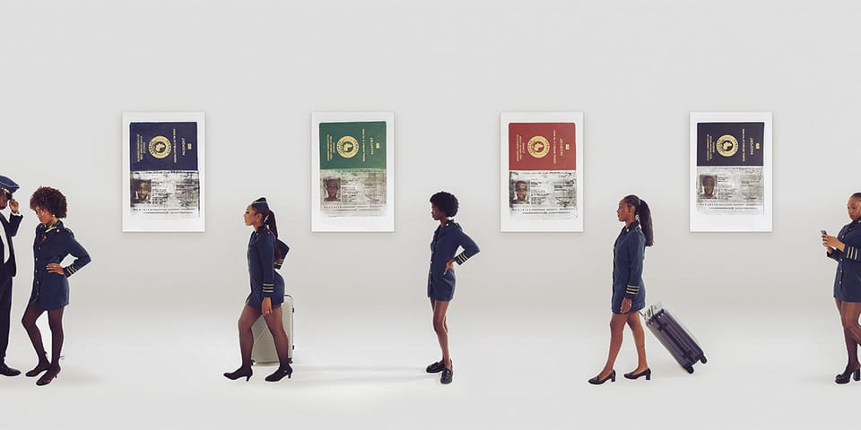 SOLIDER has crafted four canvas paintings of West African passports with discolored pages that reflect a biased justice system, deeming him a citizen of the world. The campaign captures an airplane Capitan with five stewardesses wearing “SOLDIER AIR” uniforms and posing alongside the paintings with pride.