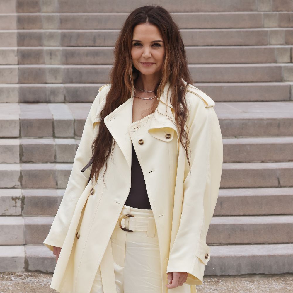 Wearing her butter yellow look with a similarly rich shade, Holmes paired her pale yellow Zimmermann Cargo Jacket (£1,400) and Zimmermann Cargo Pants (£795) with a chocolate brown Scoop Bodysuit (£275), which she wore to sit front row at the brand’s autumn/winter 2025 show.