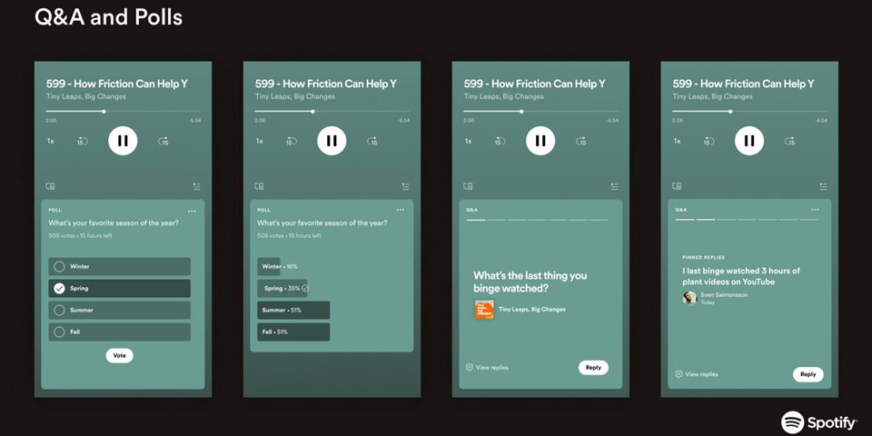 Polls and Q&As will appear at the bottom of a podcast episode page on the Spotify mobile app on both iOS and Android, where users can respond to a given prompt while listening to a podcast. After submitting a response to a poll, listeners will immediately see how the rest of the participating audience voted in comparison to their own answer.