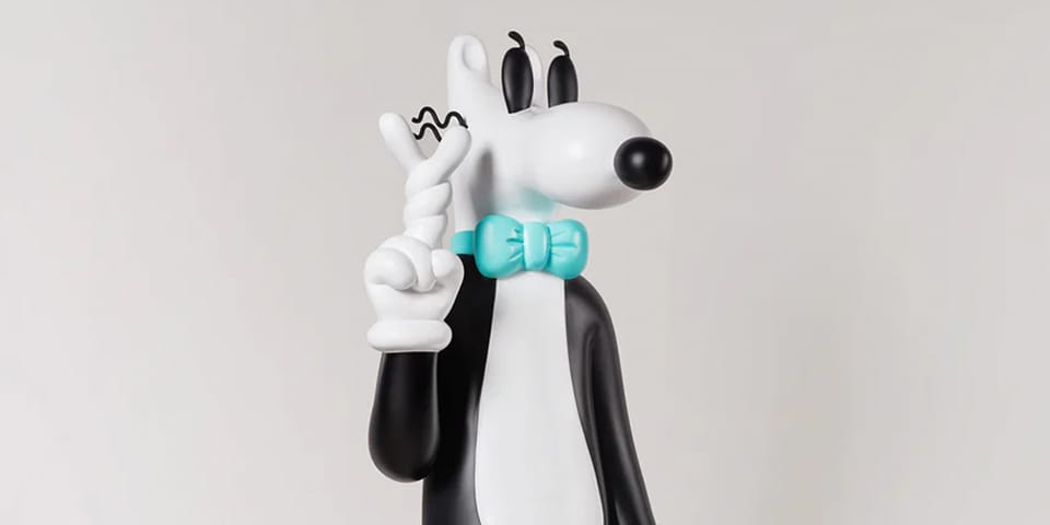 The latest entry in the Mello line measures 5 feet tall x 2 feet wide x 1 feet 10 inches deep. Dressed in a teal bowtie, the dog’s right hand is twisted in comical proportions while giving up the peace sign. For those looking to collect, the sculpture will release on May 5 at 10am PST. But to ensure your chances to purchase, register for Harrington’s “Early Art-Drop list” to beat the line.