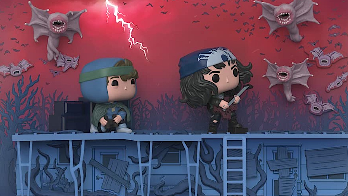 The new product was revealed during Funko Fair 2023. It’s part of Funko’s “Deluxe Pop! Moment” series and depicts Eddie (with guitar) and Dustin alongside the evil Demobats.