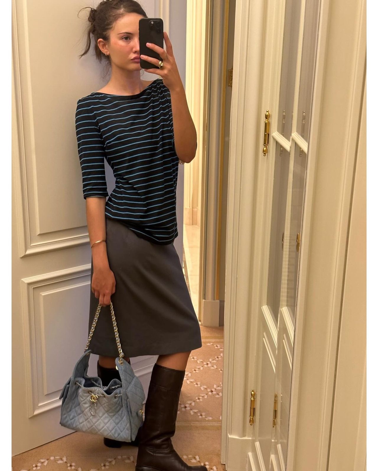 Influencer @rubylyn_ wears the Chanel 25 Handbag in blue denim with a linen pencil skirt and striped t-shirt.