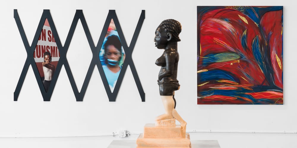 The exhibition features works by 17 artists, including Adrian Armstrong, Maya Beverly, Sanford Biggers, Layo Bright, Ryan Cosbert, Pamela Council, Damien Davis, Larissa de Jesus Negron, Audrey Lyall, Muna Malik, Gisela McDaniel, Helina Metaferia, Yetunde Olabaju, Hiba Schahbaz, Maya Seas, Tariku Shiferaw and Roscoe B. Thicke III. Their creations span various mediums such as painting, sculpture, and collage.