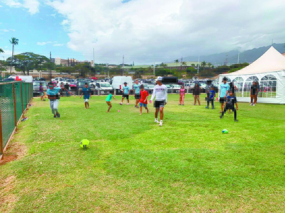 Baldwin student-athletes play soccer with kids staying at the War Memorial shelter. The Maui News / ROBERT COLLIAS