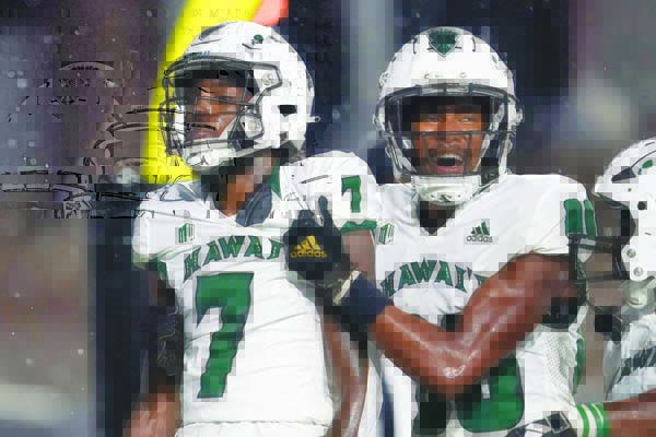 The second TD came with 4:49 left on a 1-yard keeper by reserve quarterback Dalen Morris to pull within 35-28 after the Rainbow Warriors forced a turnover on downs. Hawaii nearly recovered the ensuing onside kick, but Jalen Smith’s right elbow was out of bounds as he recovered the ball.