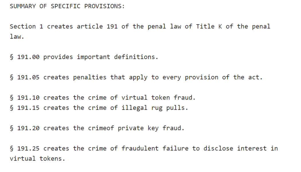 New York State Senator Kevin Thomas introduced a new bill amendment request to establish certain offenses related to rug pulls and other frauds related to virtual token distribution, misuse of private keys and hidden interests in crypto projects. The bill drafted by Sen. Thomas, Senate Bill S8839, calls for defining, penalizing and criminalizing frauds specifically targeted at developers and projects that intend to dupe crypto investors. A snippet of Senate Bill S8839. Source: nysenate.gov Through the bill, Thomas seeks to provide prosecutors with a clear legal framework against crypto crimes that align with the spirit of the blockchain while combatting fraud. It calls for a law amendment that will imply rug pull charges on developers that sell “more than 10% of such tokens within fiv...