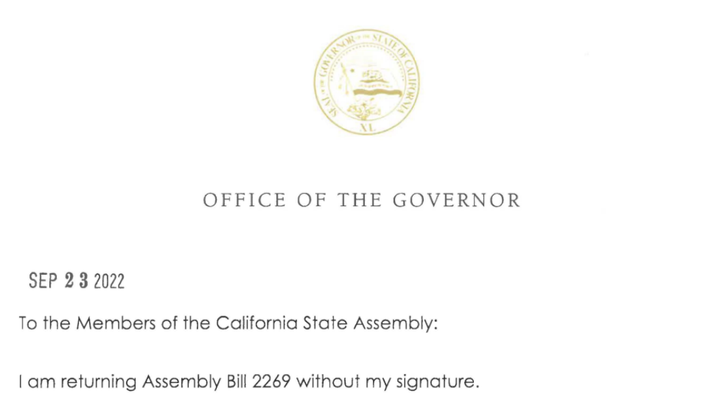 Adding to the existing regulatory hurdles for the crypto ecosystems, California Governor Gavin Newsom refused to sign a bill that would establish a licensing and regulatory framework for digital assets. Assembly Bill 2269 sought to allow the issuance of operational licenses for crypto companies in California. On Sept. 1, California State Assembly passed the bill with no opposition from the assembly floor and went on to the governor’s office for approval. Letter of rejection from Gov. Mewsom. Source: leginfo.legislature.ca.gov Opposing the notion, Newsom recommended a “more flexible approach” that would evolve over time while considering the safety of consumers and related costs, adding: “It is premature to lock a licensing structure in statute without considering both this work (...