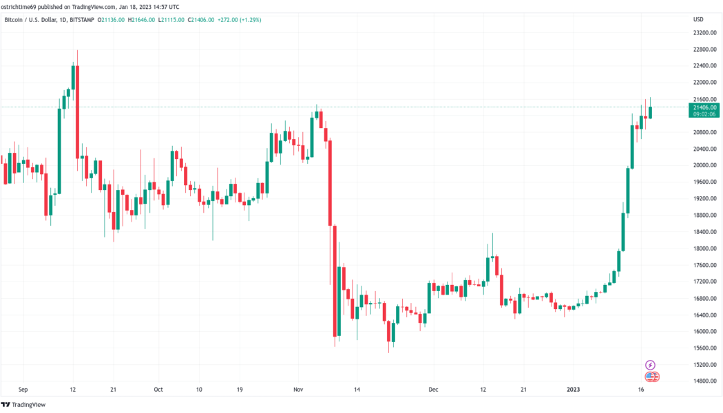 Bitcoin (BTC) spiked higher around the Jan. 17 Wall Street open as nervous analysts waited for further cues. BTC/USD 1-hour candle chart (Bitstamp). Source: TradingView Opinions diverge over Bitcoin’s fate Data from Cointelegraph Markets Pro and TradingView showed BTC/USD briefly touching $21,594 on Bitstamp, marking its highest since Sep. 13. As bullish impulses continued to hit the chart, reactions stayed conservative amid an atmosphere of suspicion over the true source of Bitcoin’s return to form. One such cautious take came from Michaël van de Poppe, founder and CEO of trading firm Eight, who eyed behavior around a key exponential moving average (EMA) across crypto. “Food for thought; Total market capitalization and the altcoin market capitalization are both at the 200-day EMA...