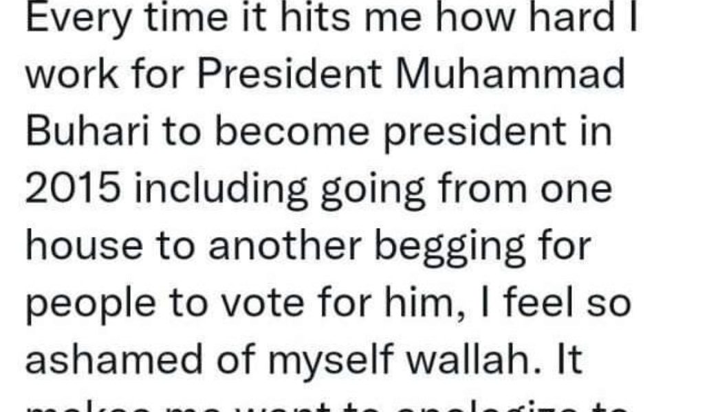 Tweet Tweet Share Whatsapp reddit Every time it hits me how hard I work for President Muhammad Buhari to become president in 2015 including going from one house to another begging for people to vote for him, I feel so ashamed of myself wallah. It makes me want to apologize to Nigerians over and over again. .uc4ed8861321b6404965fb7db9e4fa6fe { padding:0px; margin: 0; padding-top:1em!important; padding-bottom:1em!important; width:100%; display: block; font-weight:bold; background-color:inherit; border:0!important; border-left:4px solid #16A085!important; box-shadow: 0 1px 2px rgba(0, 0, 0, 0.17); -moz-box-shadow: 0 1px 2px rgba(0, 0, 0, 0.17); -o-box-shadow: 0 1px 2px rgba(0, 0, 0, 0.17); -webkit-box-shadow: 0 1px 2px rgba(0, 0, 0, 0.17); text-decoration:none; } .uc4ed8861321b6404965fb7db9e4...