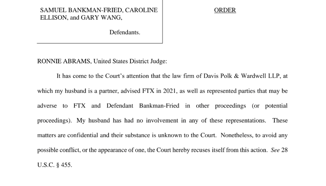 The ongoing legal proceedings around former FTX CEO Sam Bankman-Fried (SBF) took a new turn as District Judge Ronnie Abrams withdrew her participation from the case. The United States District Court for the Southern District of New York rescued itself from the FTX case after revealing that a law firm — which employs Abrams’ husband as a partner — had advised the crypto exchange in 2021. In a Dec. 23 filing, Judge Abrams revealed that her husband, Greg Andres, is a partner at Davis Polk & Wardwell, a law firm where he has been employed since June 2019. Additionally, it was highlighted that the law firm had advised FTX in 2021. Abrams also stated that the law firm represented parties that may be adverse to FTX and SBF in other legal proceedings. “My husband has had no involvement i...