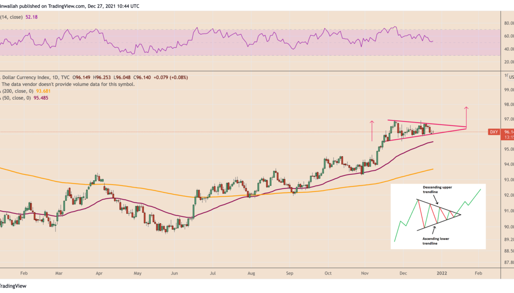 Bitcoin (BTC) regained its bullish strength after reclaiming $50,000 last week and continued to hold the psychological level as support on Dec. 27. Meanwhile, its rival for the top safe-haven spot, the U.S. dollar, also bounced off a critical price floor, hinting that it would continue rallying through into 2022. Triangle breakout The U.S. dollar index (DXY), which measures the greenback’s strength against a basket of top foreign currencies, has been trending towards the apex of a “symmetrical triangle” pattern on its daily chart. In doing so, the index has been treating the structure’s lower trendline as its solid support level, thus hinting that its next breakout would resolve to the upside. DXY daily price chart featuring symmetrical triangle setup. Source: Tradi...