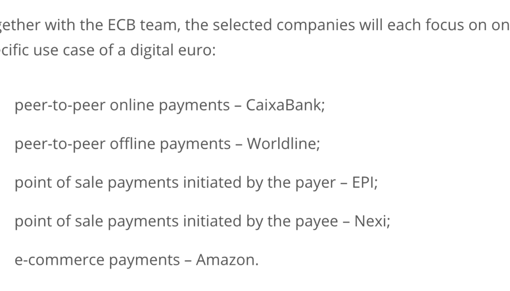 The European Central Bank, or ECB, has announced it will be collaborating with five companies for the development of potential digital euro user interfaces. In a Friday announcement, the ECB said it had chosen “Big Four” tech company Amazon, fintech firm Nexi, Spanish digital bank CaixaBank, French payments platform Worldline and the European Payments Initiative, or EPI, to each focus on developing a prototype based on specific use cases of the digital euro. According to the central bank, the firms will create front-end prototypes, which will not be used in later phases of the digital currency project. Source: ECB The ECB chose the five companies based on their fulfilling “specific capabilities” when compared to 50 other front-end developers that responded to the central bank’s...