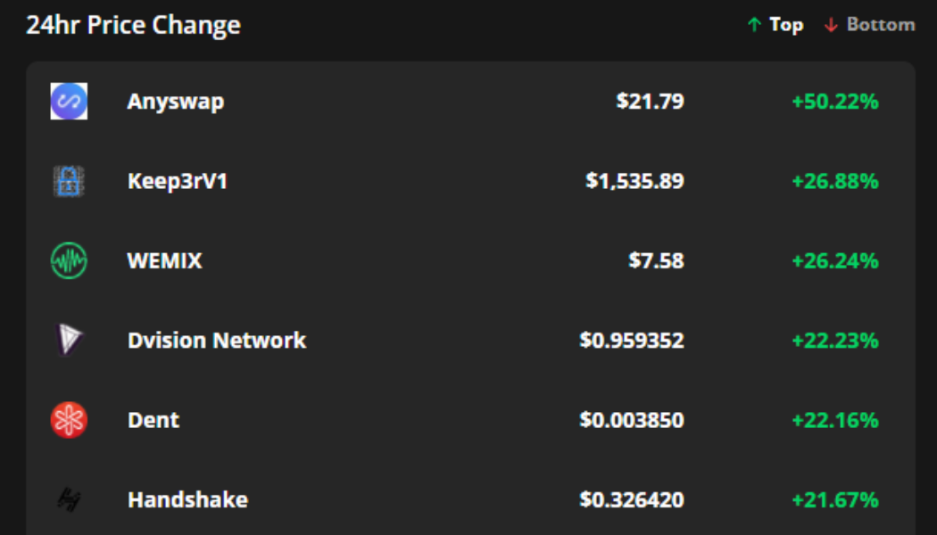 The cryptocurrency community is back in high spirits on Jan. 12 after a majority of tokens in the top 200 flashed green following Bitcoin’s (BTC) spike to $44,000. The return of bullish momentum has come as a boon to several altcoin projects, with multiple tokens seeing gains in excess of 20%. Top 7 coins with the highest 24-hour price change. Source: Cointelegraph Markets Pro Data from Cointelegraph Markets Pro and TradingView shows that the biggest gainers over the past 24-hours were Anyswap (ANY), Keep3rV1 (KP3R) and WEMIX (WEMIX). Anyswap expands its list of supported networks Gains in the altcoin market were led by Anyswap, a decentralized exchange that specializes in allowing users to transfer and swap tokens between 25 distinct networks. Data from Cointelegraph Markets Pr...
