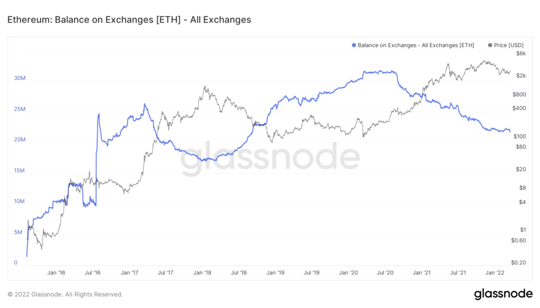 The amount of Ethereum‘s native token Ether (ETH) kept with crypto exchanges has fallen to its lowest levels since September 2018, signaling traders‘ intention to hold the tokens in hopes of a price rally in 2022. Notably, nearly 550,000 ETH — worth around $1.61 billion — have left centralized trading platforms year-to-date, according to data provided by Glassnode. The massive outflow has reduced the exchanges‘ net-Ether balance to 21.72 million ETH, down from its record high of 31.68 million ETH in June 2020. Ethereum balance on all exchanges as of March 18, 2022. Source: Glassnode Biggest weekly ETH outflow since October 2021 Interestingly, over 30% of all Ether‘s withdrawals from exchanges witnessed in 2022 appeared earlier this week, data from IntoTheBlock shows. In detail, over 180,00...