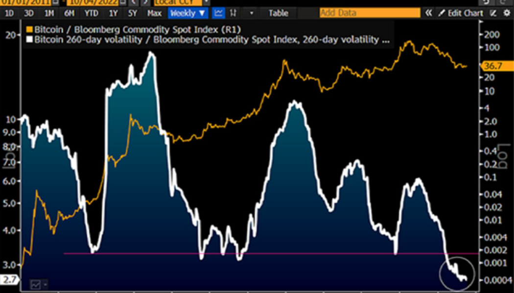 Senior commodity strategist at Bloomberg Intelligence, Mike McGlone, stated October has historically been the best month for Bitcoin (BTC) since 2014, averaging gains of about 20% for the month, and that commodities appearing to peak could imply that Bitcoin has reached its bottom. In an Oct. 5 Bloomberg Crypto Outlook report, McGlone says while the rise of interest rates globally is putting downwards pressure on most assets, Bitcoin is gaining the upper hand when compared with commodities and tech stocks like Tesla, with the report noting: “When the ebbing economic tide turns, we see the propensity resuming for Bitcoin, Ethereum, and the Bloomberg Galaxy Crypto Index to outperform most major assets.” McGlone notes that Bitcoin has its lowest ever volatility against the Bloomberg Comm...