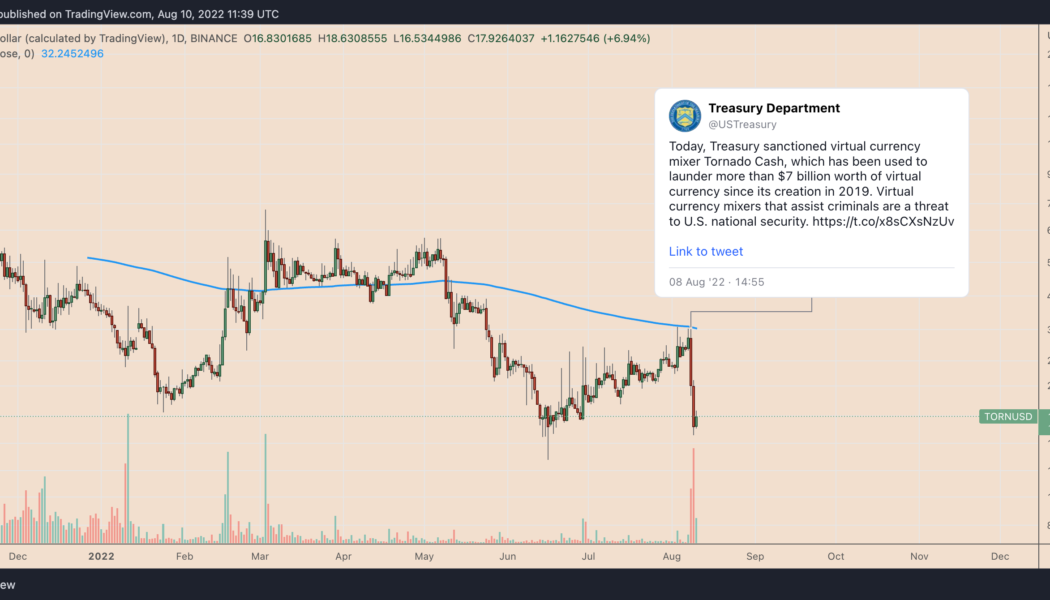 Tornado Cash (TORN) has lost almost half its market valuation two days after being slapped with sanctions by the U.S. Treasury Department. The department accused Tornado Cash, a crypto mixer platform, of laundering more than $7 billion in cryptocurrencies, including a stash of $455 million allegedly stolen by North Korea-based hackers. Immediate reactions were followed by U.S.-based crypto companies, including Circle and Coinbase. In a controversial move, the popular crypto firms blocked the movements of their jointly-issued stablecoin USDC tied to Tornado Cash’s blacklisted smart contracts. TORN price drops 45% The news prompted traders to limit their exposure to TORN, Tornado Cash’s native token. On the daily chart, TORN’s price has slipped by approximately 45...