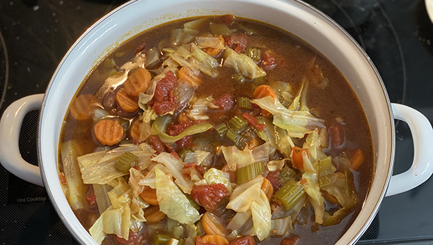 - In a large pot, stir together the broth, onion, garlic, cabbage, carrots, celery, salt, pepper, oregano, basil and diced tomatoes.