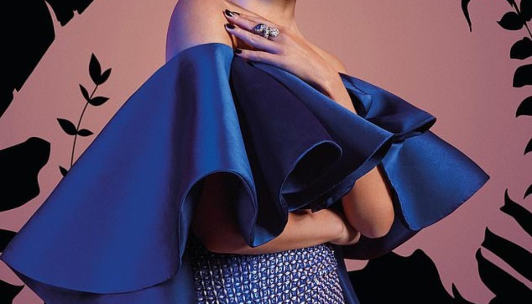 The 27-year-old model wore a bright blue off-shoulder top with dramatic silk ruffles cascading down behind her and a figure-hugging, patterned skirt for the latest cover of the luxury fashion magazine.