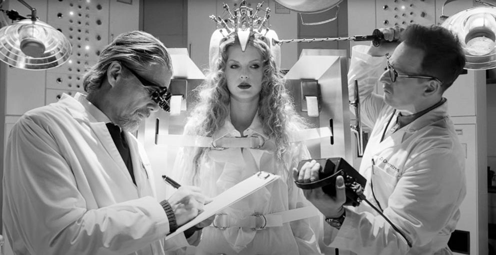 The video, which is in black and white, begins with Swift in a psych ward of sorts and wiping her face to reveal tattoos similar to Post Malone’s. Then in another scene, she walks into a room wearing a black Victorian mourning dress, where others, including Post Malone, are typing on vintage typewriters. She types the lyrics of the song, “I love you, it’s ruining my life.”