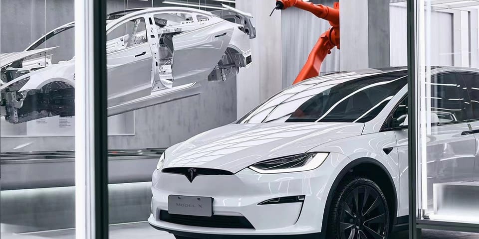 An unfinished Tesla Model 3 chassis can be seen suspended in the middle of the space accompanied by giant red robot arms as seen on the assembly lines. Individual car parts are exhibited to educate visitors on the inner workings of the vehicles, meanwhile, free seating and meeting rooms are present to accommodate guests. Fully built Tesla models are also parked freely inside and outside the store for customers to experience the cars in full.